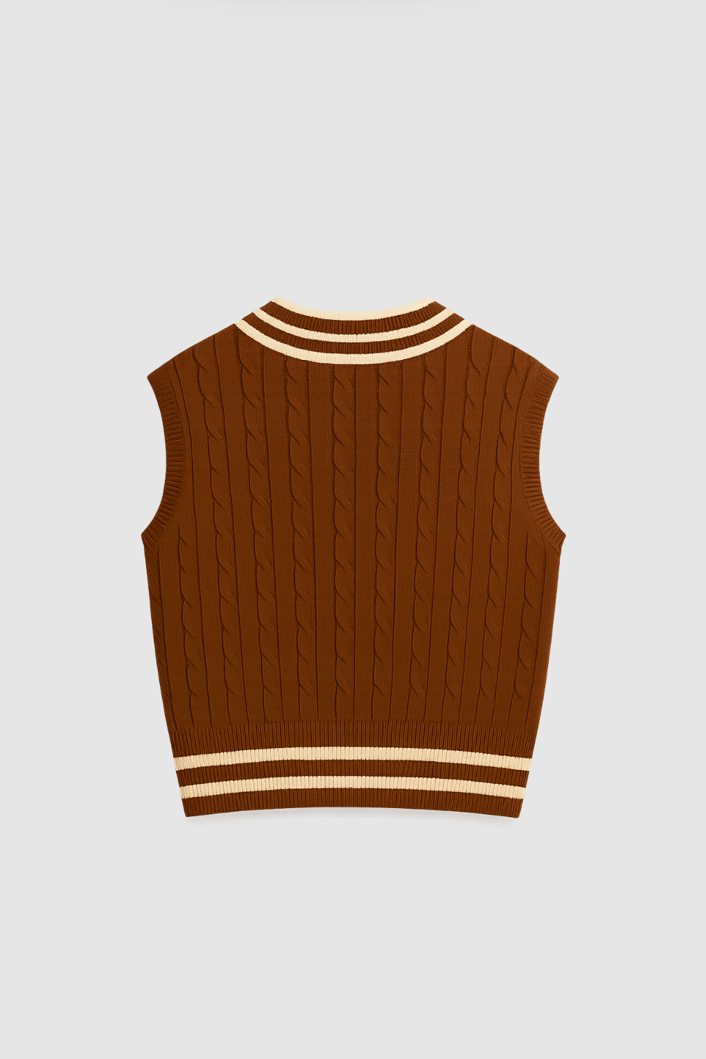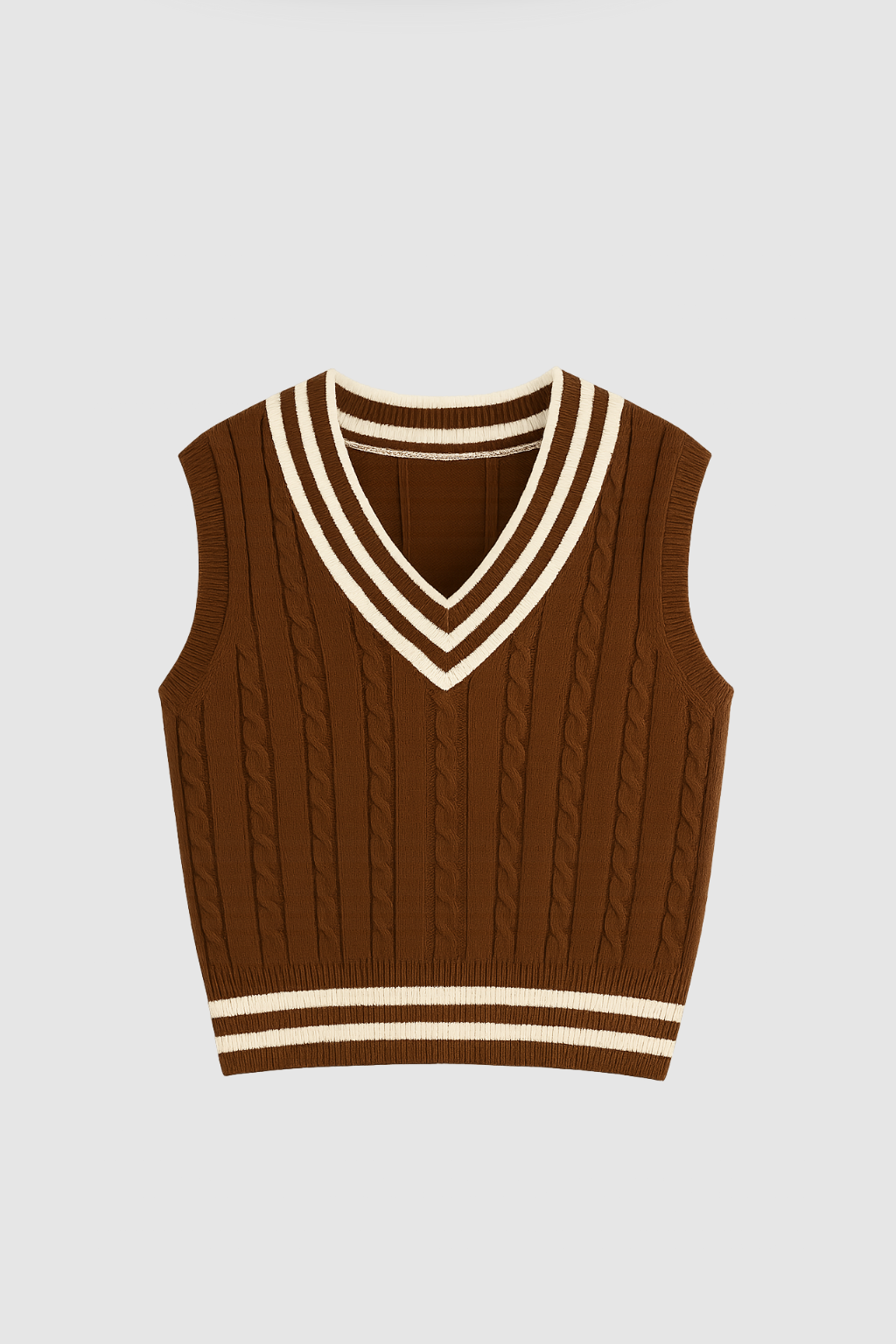 Este chaleco sin mangas de punto trenzado combina el estilo vintage con un toque coreano moderno. Con cuello en “V” y detalles a rayas en contraste, es perfecto para superponer sobre camisas o blusas en cualquier estación. Confeccionado en mezcla de algodón y acrílico, ofrece suavidad, ligereza y un ajuste cómodo.